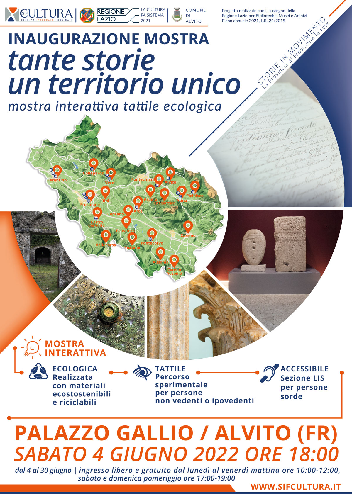 Sabato 4 giugno 2022 alle ore 18:00 presso il salone del Palazzo Gallio in Alvito inaugurazione della mostra ideata dal Sistema Integrato Frusinate per la Cultura nell’ambito del progetto STORIE IN MOVIMENTO. LA PROVINCIA DI FROSINONE FA RETE, finanziato dalla Regione Lazio (Avviso pubblico LA CULTURA FA SISTEMA 2021 – Azione 4).